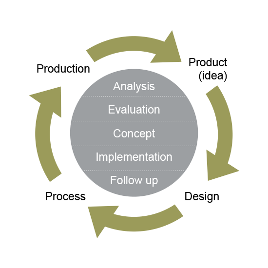 We analyse the existing processes and products on their resource efficiency, compile and evaluate together with the staff concerned the potential for optimisation. Finally, we initiate by involving the staff a process of change for ensuring sustainability. A prerequisite for sustainable action is the balance of economy, ecology and society.